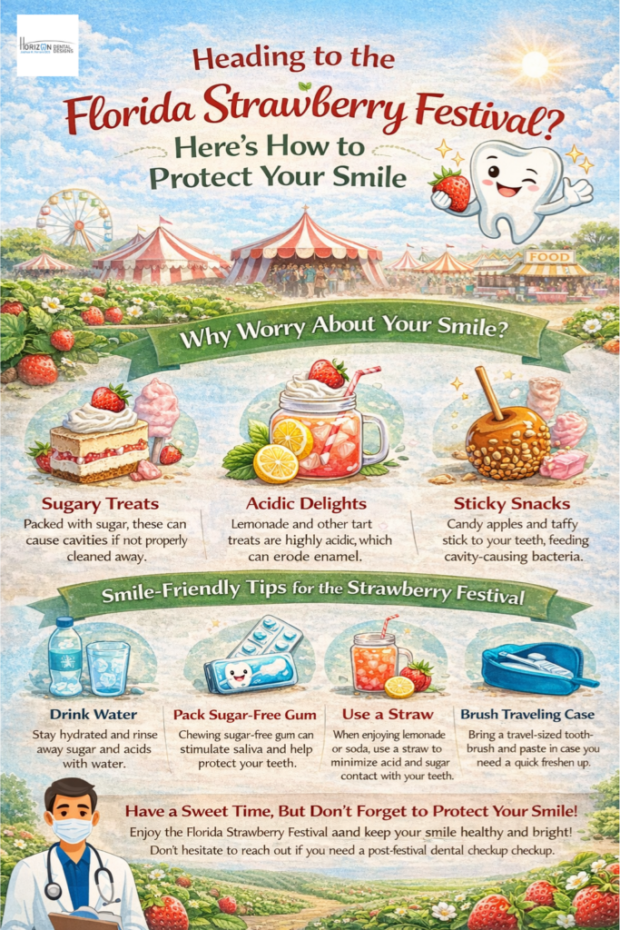 As your go-to Plant City dentist, we see a real uptick in patients coming in after festival season with minor issues that could have been caught — and prevented from worsening with a routine checkup. A professional cleaning at Horizon Dental Designs before the festival removes plaque and tartar buildup so your teeth start the season in the best possible condition. A post-festival visit lets us check for any early-stage erosion or cavities that developed during the indulgent stretch of February and March.